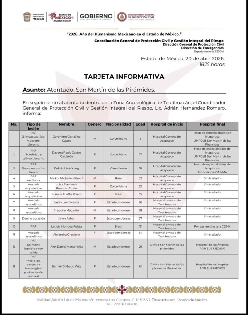 Ciudad de México, 21 de abril de 2026.– Las investigaciones sobre el ataque armado en la zona arqueológica de Teotihuacán apuntan a que el agresor, identificado como Julio César Jasso Ramírez, actuó motivado por una combinación de discurso de odio y la intención de imitar la masacre de Columbine, uno de los tiroteos más emblemáticos en Estados Unidos.