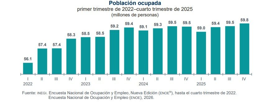 Durante el periodo octubre-diciembre de 2025, la población ocupada alcanzó 59.8 millones de personas, lo que representó un incremento anual de 298 mil trabajadores, reflejando una mayor capacidad de la economía para generar empleo formal e informal en distintos sectores productivos.