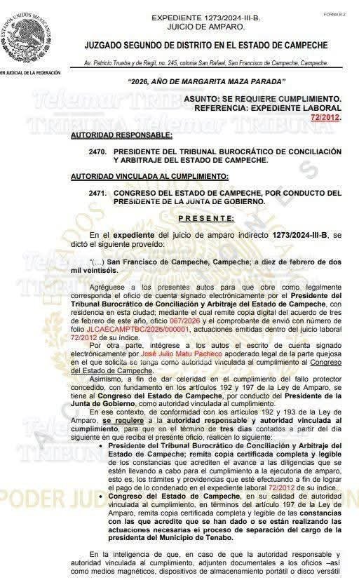 SAN FRANCISCO DE CAMPECHE, Camp., a 11 de febrero de 2026.– La jueza Segundo de Distrito en el Estado de Campeche, Roxana Hernández López, ordenó al Congreso del Estado de Campeche iniciar el proceso de separación del cargo de la alcaldesa de Tenabo, Mariela Sánchez Espinoza, en cumplimiento de una resolución emitida el pasado 10 de febrero de 2026, derivada de un juicio laboral.
