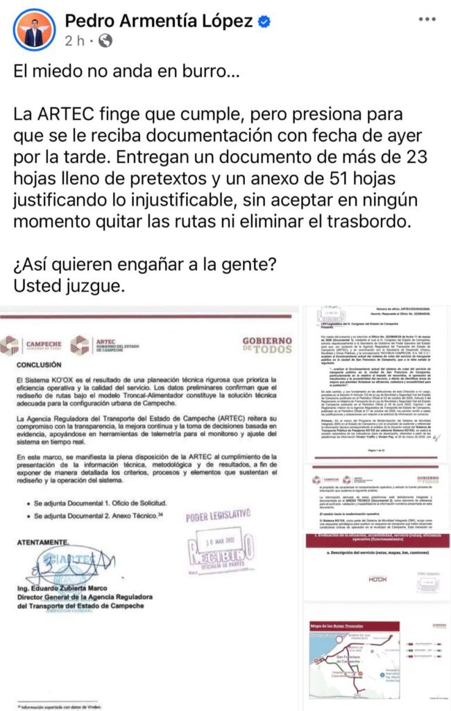 Pese a la postura oficial, la entrega del informe generó reacciones en el ámbito legislativo. A través de redes sociales, el coordinador de la bancada de Movimiento Ciudadano, Pedro Armentía López, cuestionó tanto la forma como el fondo del documento presentado por la ARTEC.