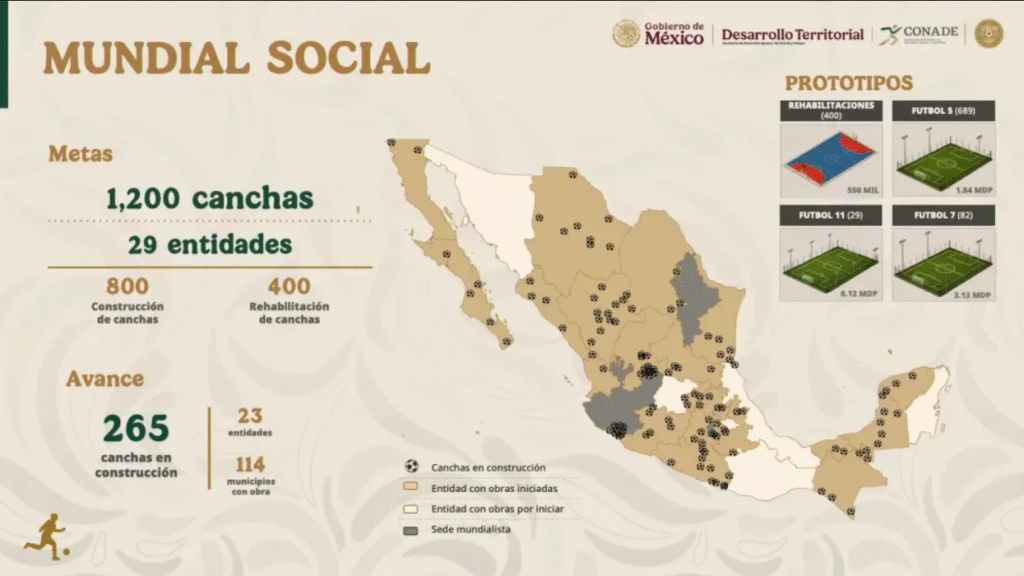 De acuerdo con el informe presentado durante la conferencia matutina presidencial, 265 canchas ya se encuentran en proceso de construcción en 23 estados y más de un centenar de municipios, como parte de la estrategia denominada “Mundial Social México 2026”.