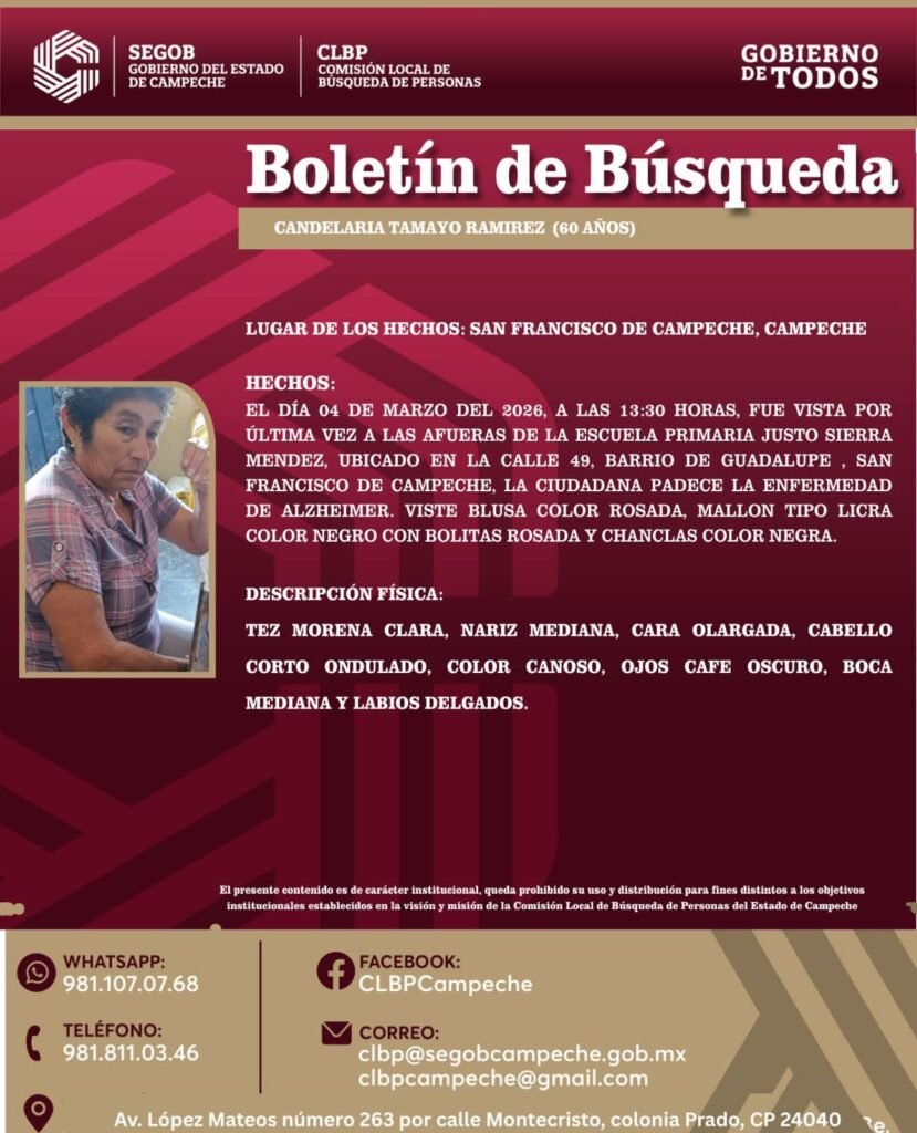 Posteriormente, la mujer fue trasladada a la Comisión Local de Búsqueda de Personas del Estado de Campeche, instancia que ya contaba con una ficha relacionada con su localización. Minutos más tarde, su hija acudió al lugar para recibirla y llevarla de regreso a casa.