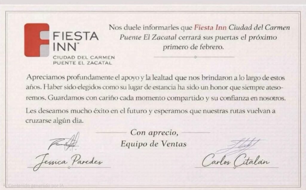 Ciudad del Carmen, Camp., a 29 de enero de 2026. — Ciudad del Carmen vuelve a encender focos rojos en su economía. A unos días de cerrar enero, dos marcas nacionales bajan la cortina: el hotel Fiesta Inn Ciudad del Carmen Puente El Zacatal dejará de operar el 1 de febrero y el restaurante Toks en Plaza Real ya cerró de forma definitiva. Las salidas no sólo golpean al sector servicios, también reflejan el enfriamiento económico que persiste en la isla, pese al discurso oficial de crecimiento.