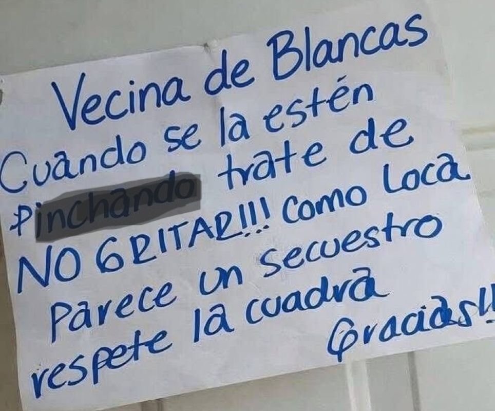 El recado, que ya circula entre vecinos y redes sociales, señala textualmente: “Vecina de blancas, cuando se la estén pinchando trate de no gritar como loca, parece un secuestro, respete a la cuadra, gracias”.