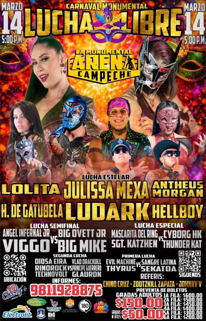 El espectáculo se realizará el próximo 14 de marzo a las 17:00 horas en la Monumental Arena Campeche, como parte de la función especial denominada “Carnaval Monumental”, que marcará el inicio oficial del calendario luchístico del recinto con una cartelera de primer nivel.