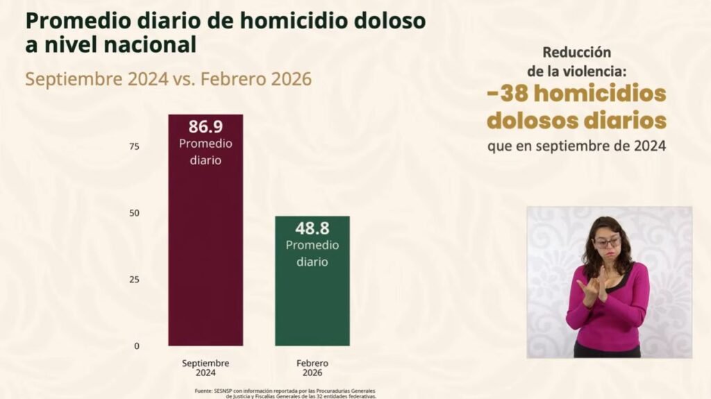 De acuerdo con los datos oficiales, el promedio nacional pasó de 86.9 homicidios diarios al inicio de la actual administración a 48.8 en febrero de 2026, lo que refleja una tendencia descendente en los últimos meses.