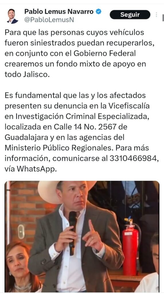 Tapalpa, Jal., a 5 de marzo de 2026.— El gobernador de Jalisco, Pablo Lemus Navarro, anunció la creación de un fondo conjunto entre el gobierno estatal y el federal para apoyar a propietarios de vehículos que resultaron dañados o incendiados durante los bloqueos registrados el 23 de febrero, tras el abatimiento de Nemesio Oseguera Cervantes, alias “El Mencho”, líder del Cártel Jalisco Nueva Generación (CJNG).