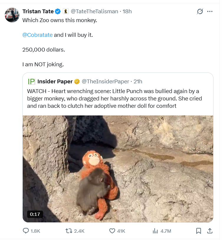El comentario fue publicado en la red social X, donde Tate preguntó qué zoológico es propietario del ejemplar y aseguró que pagaría esa cantidad por él, afirmando que “no estaba bromeando”.