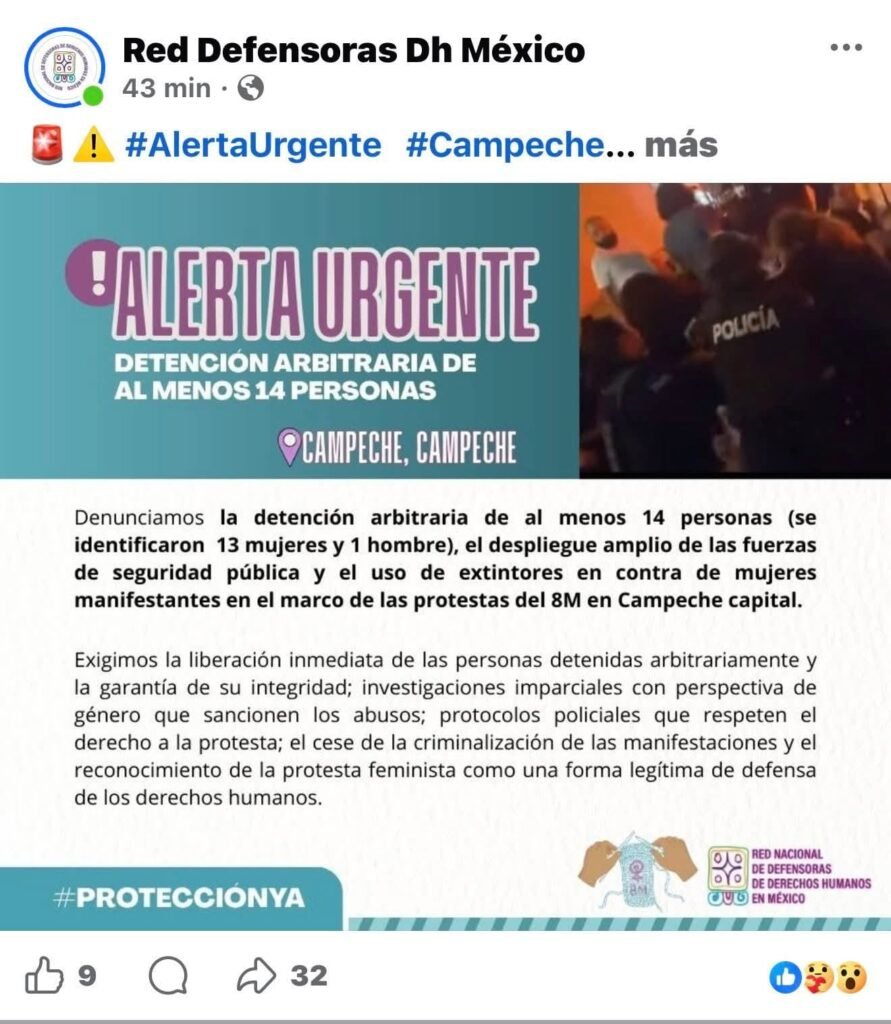 La Red Nacional de Defensoras de Derechos Humanos en México alertó sobre la detención de al menos 14 personas —entre ellas 13 mujeres y un hombre— y denunció el amplio despliegue de fuerzas de seguridad durante la manifestación, además del uso de extintores contra participantes en la protesta.