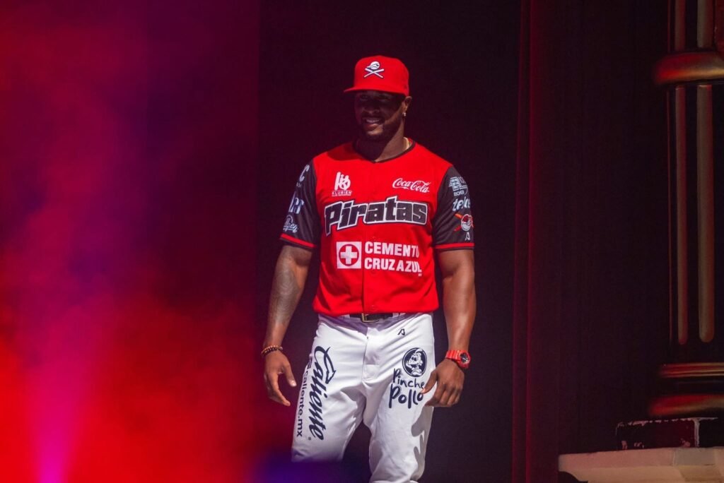 El lanzador Onelki García abrió la presentación con un uniforme en tonos rojos: gorra y jersey con la palabra “Piratas”, acompañados de pants blancos, destacando la fuerza y energía del club.