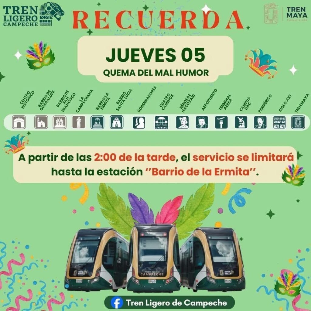 SAN FRANCISCO DE CAMPECHE, CAMP., 5 de febrero de 2026.— Con motivo del inicio del Carnaval de Campeche 2026 y el cierre parcial del malecón, el Tren Ligero de Campeche informó que este jueves realizará un ajuste temporal en su recorrido habitual.